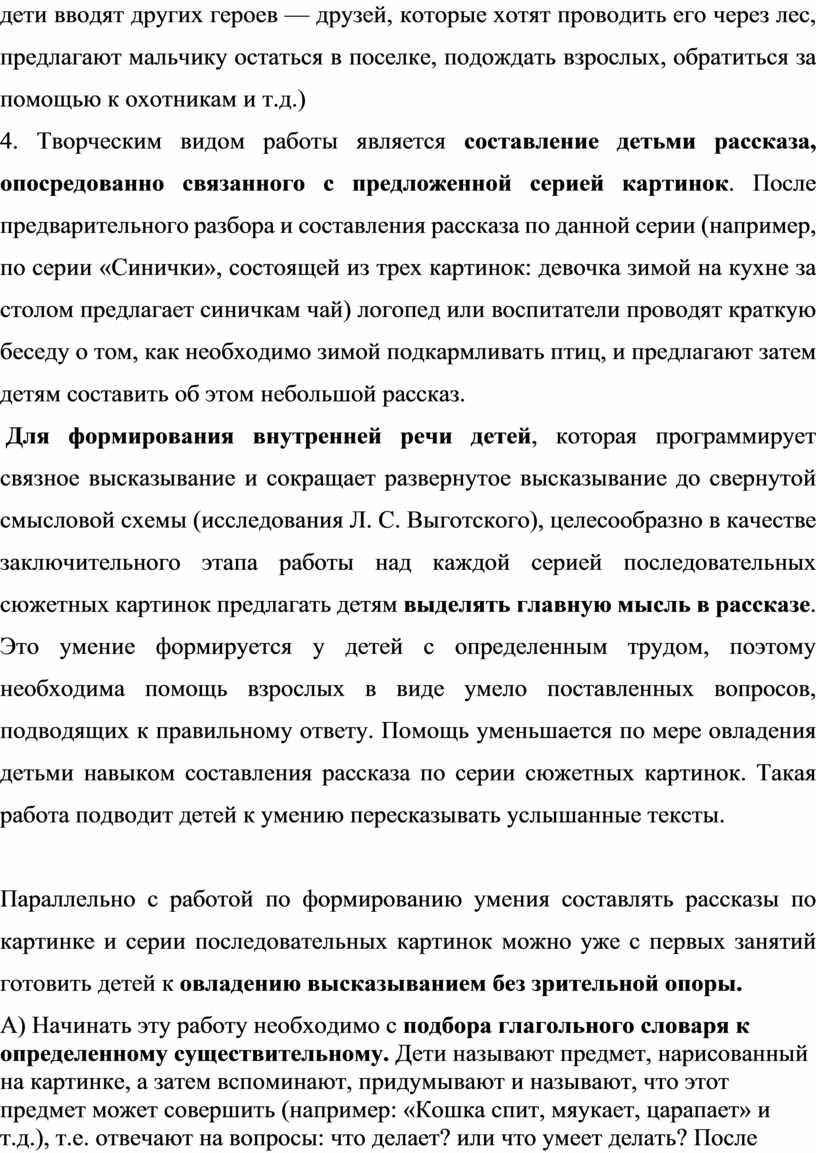 Для формирования внутренней речи детей, которая программирует связное высказывание и сокращает развернутое высказывание до свернутой смысловой схемы (исследования Л. С. Выготского), целесообразно в качестве заключительного этапа работы над каждой серией последовательных сюжетных картинок предлагать детям выделять главную мысль в рассказе. Это умение формируется у детей с определенным трудом, поэтому необходима помощь взрослых в виде умело поставленных вопросов, подводящих к правильному ответу. Помощь уменьшается по мере овладения детьми навыком составления рассказа по серии сюжетных картинок. Такая работа подводит детей к умению пересказывать услышанные тексты.