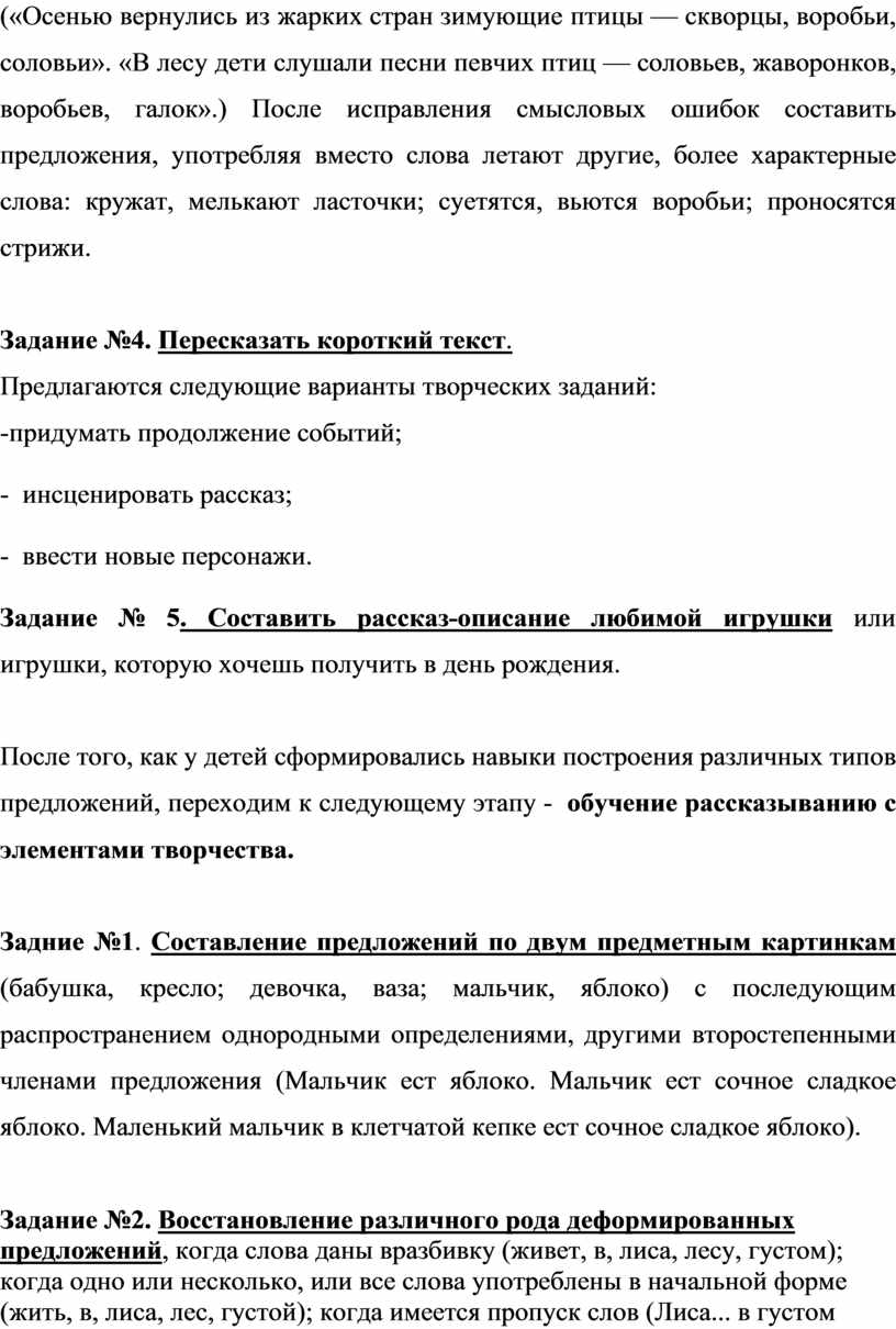 По мере формирования у детей умения конструировать высказывание необходимо подвести их к выполнению более сложных заданий, пробуждающих воображение и активизирующих творческую самостоятельность. К числу таких заданий можно отнести приведенные ниже.