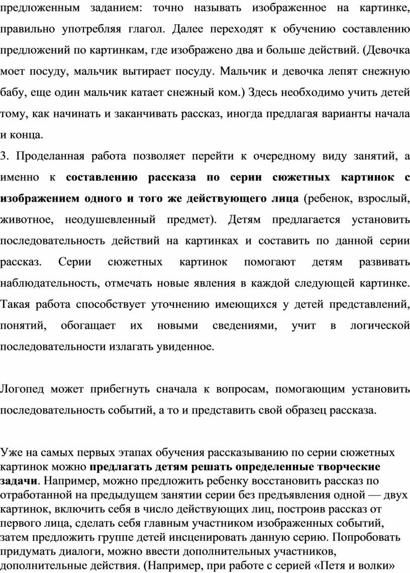 3. Проделанная работа позволяет перейти к очередному виду занятий, а именно к составлению рассказа по серии сюжетных картинок с изображением одного и того же действующего лица (ребенок, взрослый, животное, неодушевленный предмет). Детям предлагается установить последовательность действий на картинках и составить по данной серии рассказ. Серии сюжетных картинок помогают детям развивать наблюдательность, отмечать новые явления в каждой следующей картинке. Такая работа способствует уточнению имеющихся у детей представлений, понятий, обогащает их новыми сведениями, учит в логической последовательности излагать увиденное.