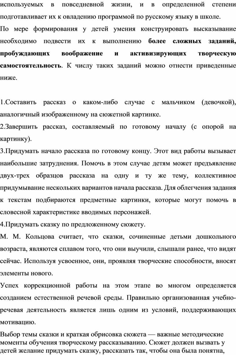 М. М. Кольцова считает, что сказки, сочиненные детьми дошкольного возраста, являются сплавом того, что они выучили, слышали ранее, что видят сейчас. Используя усвоенное, они, проявляя творческие способности, вносят элементы нового.