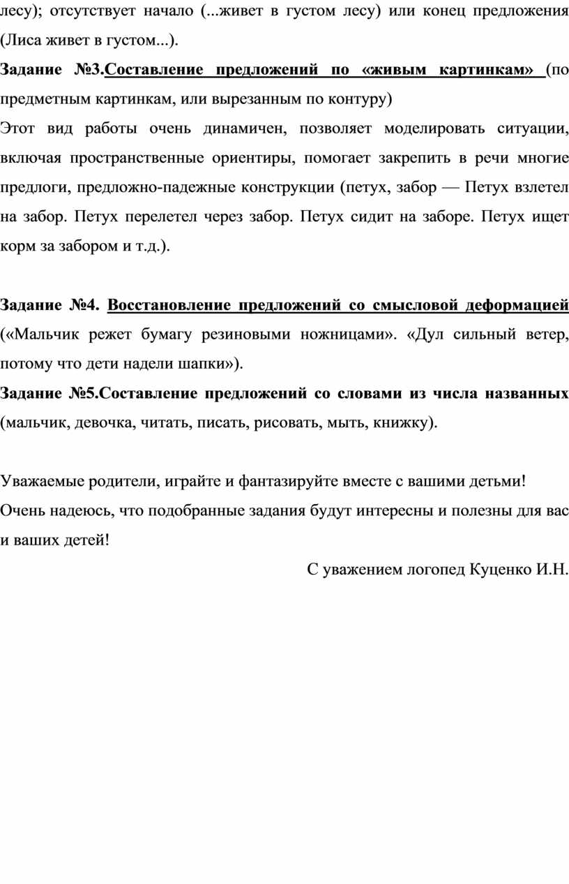 Задание №2. Восстановление различного рода деформированных предложений, когда слова даны вразбивку (живет, в, лиса, лесу, густом); когда одно или несколько, или все слова употреблены в начальной форме (жить, в, лиса, лес, густой); когда имеется пропуск слов (Лиса... в густом лесу); отсутствует начало (...живет в густом лесу) или конец предложения (Лиса живет в густом...).