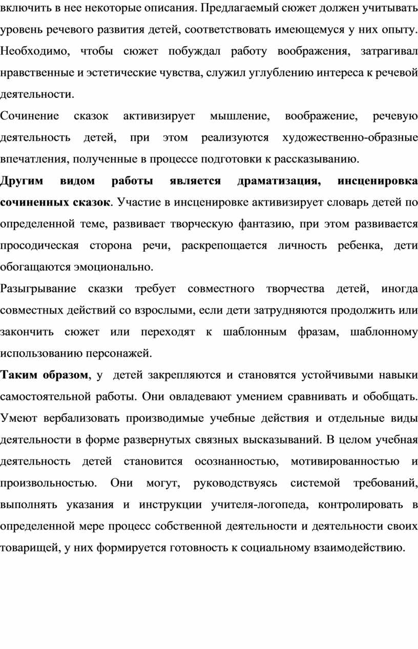 Другим видом работы является драматизация, инсценировка сочиненных сказок. Участие в инсценировке активизирует словарь детей по определенной теме, развивает творческую фантазию, при этом развивается просодическая сторона речи, раскрепощается личность ребенка, дети обогащаются эмоционально.