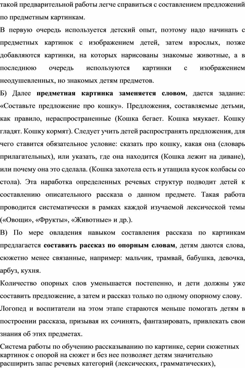 Б) Далее предметная картинка заменяется словом, дается задание: «Составьте предложение про кошку». Предложения, составляемые детьми, как правило, нераспространенные (Кошка бегает. Кошка мяукает. Кошку гладят. Кошку кормят). Следует учить детей распространять предложения, для чего ставится обязательное условие: сказать про кошку, какая она (словарь прилагательных), или указать, где она находится (Кошка лежит на диване), или почему она это сделала. (Кошка захотела есть и утащила кусок колбасы со стола). Эта наработка определенных речевых структур подводит детей к составлению описательного рассказа о данном предмете. Такая работа проводится систематически в рамках каждой изучаемой лексической темы («Овощи», «Фрукты», «Животные» и др.).