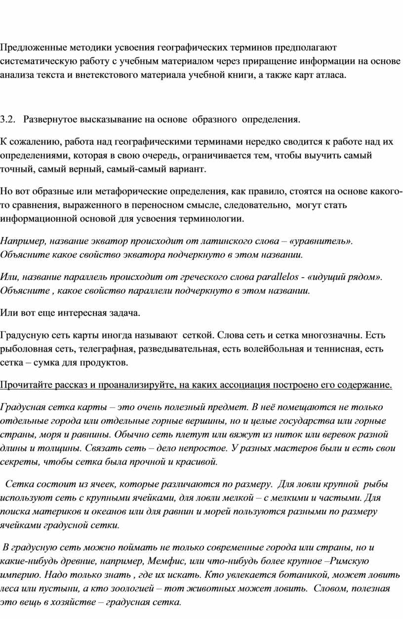 · ведение словарь географических терминов в 5 - 7 классах в тетради: обязательная запись каждого нового термина, раскрытие этимологии слова, приведение ряда однокоренных слов из различных областей знаний;