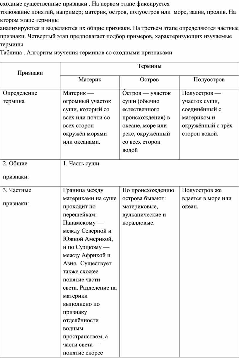 толкование понятий, например; материк, остров, полуостров или море, залив, пролив. На втором этапе термины