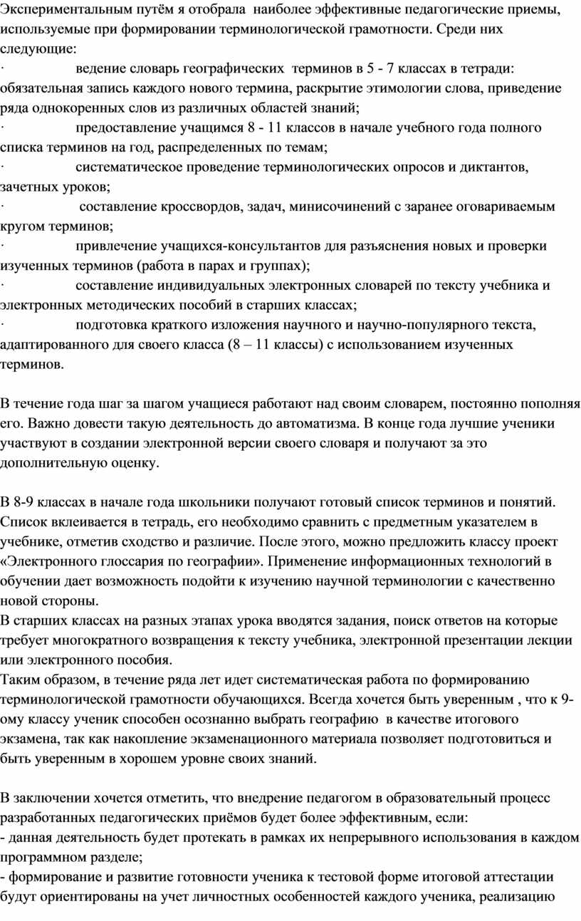 Таким образом, в течение ряда лет идет систематическая работа по формированию терминологической грамотности обучающихся. Всегда хочется быть уверенным , что к 9-ому классу ученик способен осознанно выбрать географию в качестве итогового экзамена, так как накопление экзаменационного материала позволяет подготовиться и быть уверенным в хорошем уровне своих знаний.