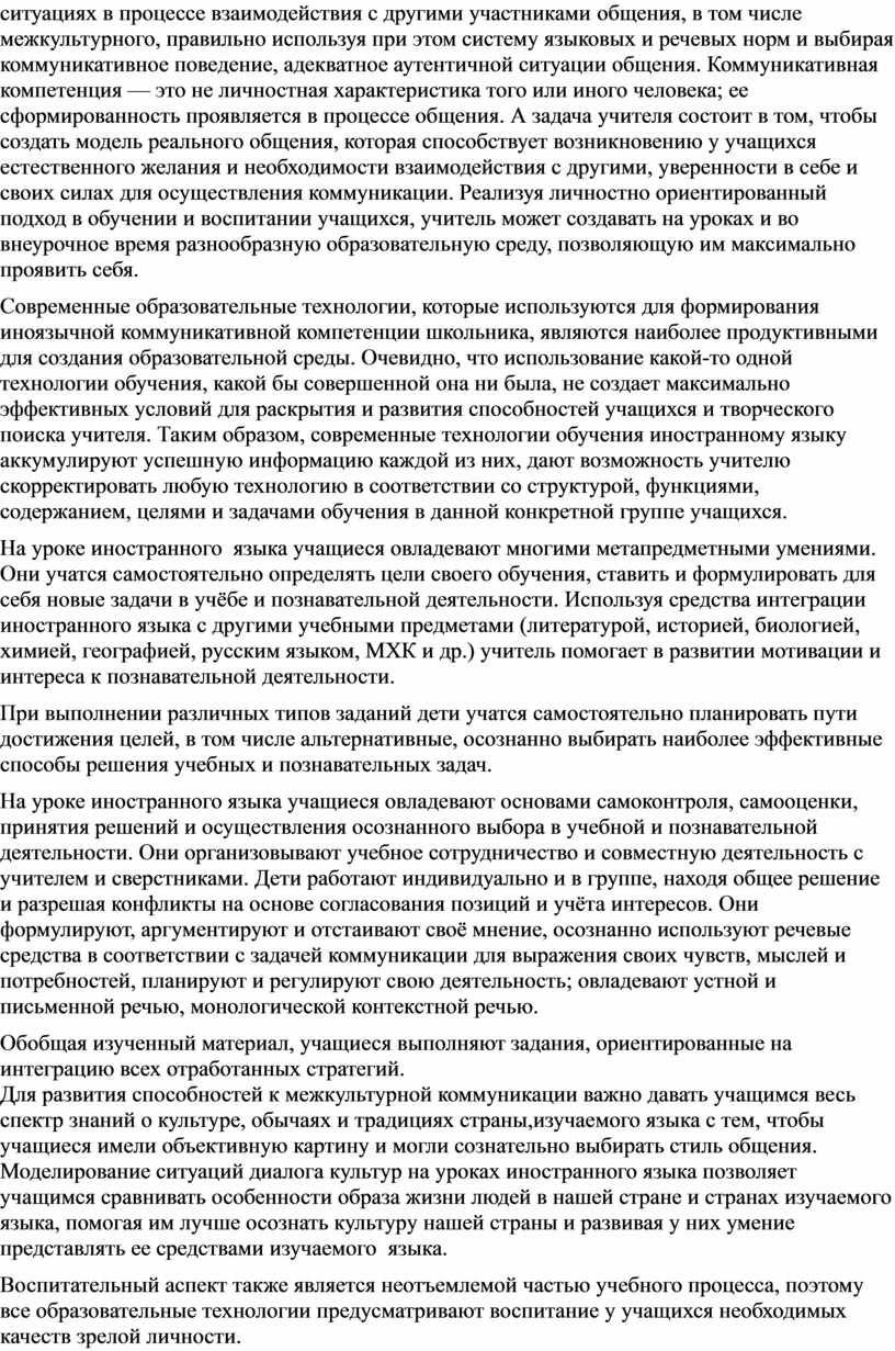Современные образовательные технологии, которые используются для формирования иноязычной коммуникативной компетенции школьника, являются наиболее продуктивными для создания образовательной среды. Очевидно, что использование какой-то одной технологии обучения, какой бы совершенной она ни была, не создает максимально эффективных условий для раскрытия и развития способностей учащихся и творческого поиска учителя. Таким образом, современные технологии обучения иностранному языку аккумулируют успешную информацию каждой из них, дают возможность учителю скорректировать любую технологию в соответствии со структурой, функциями, содержанием, целями и задачами обучения в данной конкретной группе учащихся.