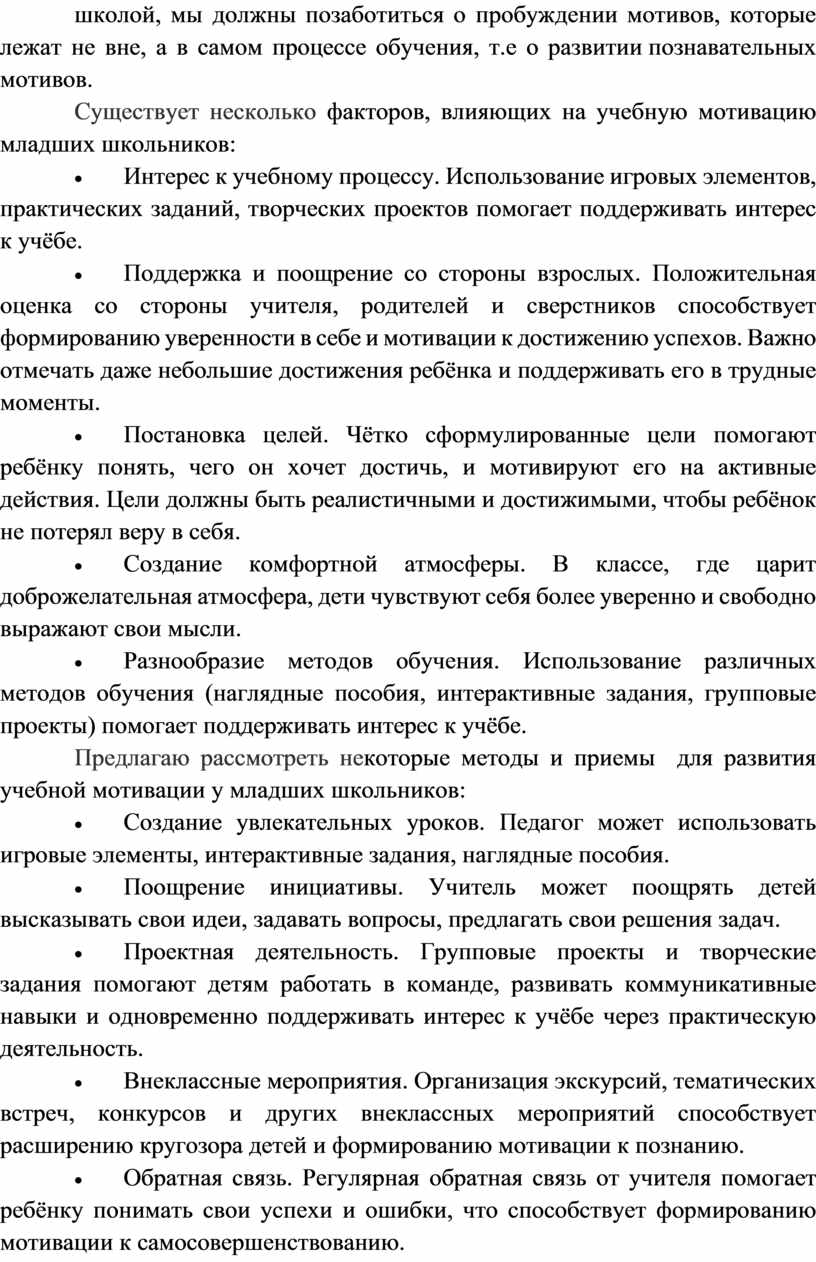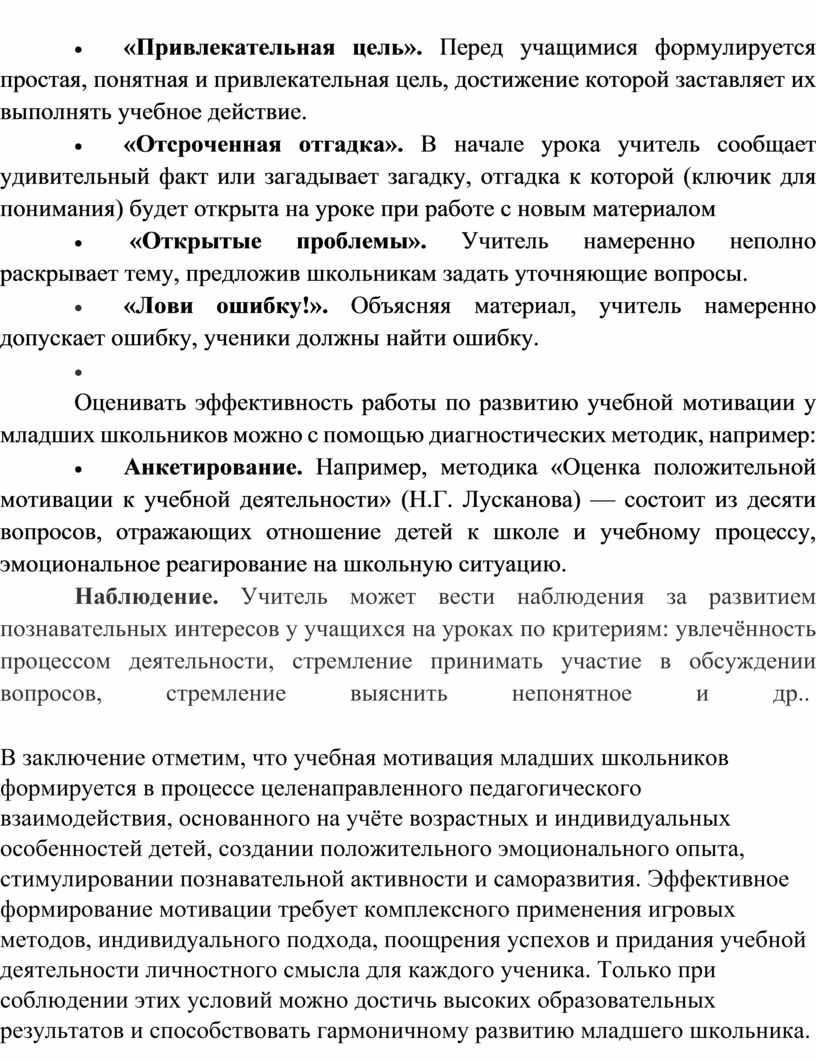 В заключение отметим, что учебная мотивация младших школьников формируется в процессе целенаправленного педагогического взаимодействия, основанного на учёте возрастных и индивидуальных особенностей детей, создании положительного эмоционального опыта, стимулировании познавательной активности и саморазвития. Эффективное формирование мотивации требует комплексного применения игровых методов, индивидуального подхода, поощрения успехов и придания учебной деятельности личностного смысла для каждого ученика. Только при соблюдении этих условий можно достичь высоких образовательных результатов и способствовать гармоничному развитию младшего школьника.