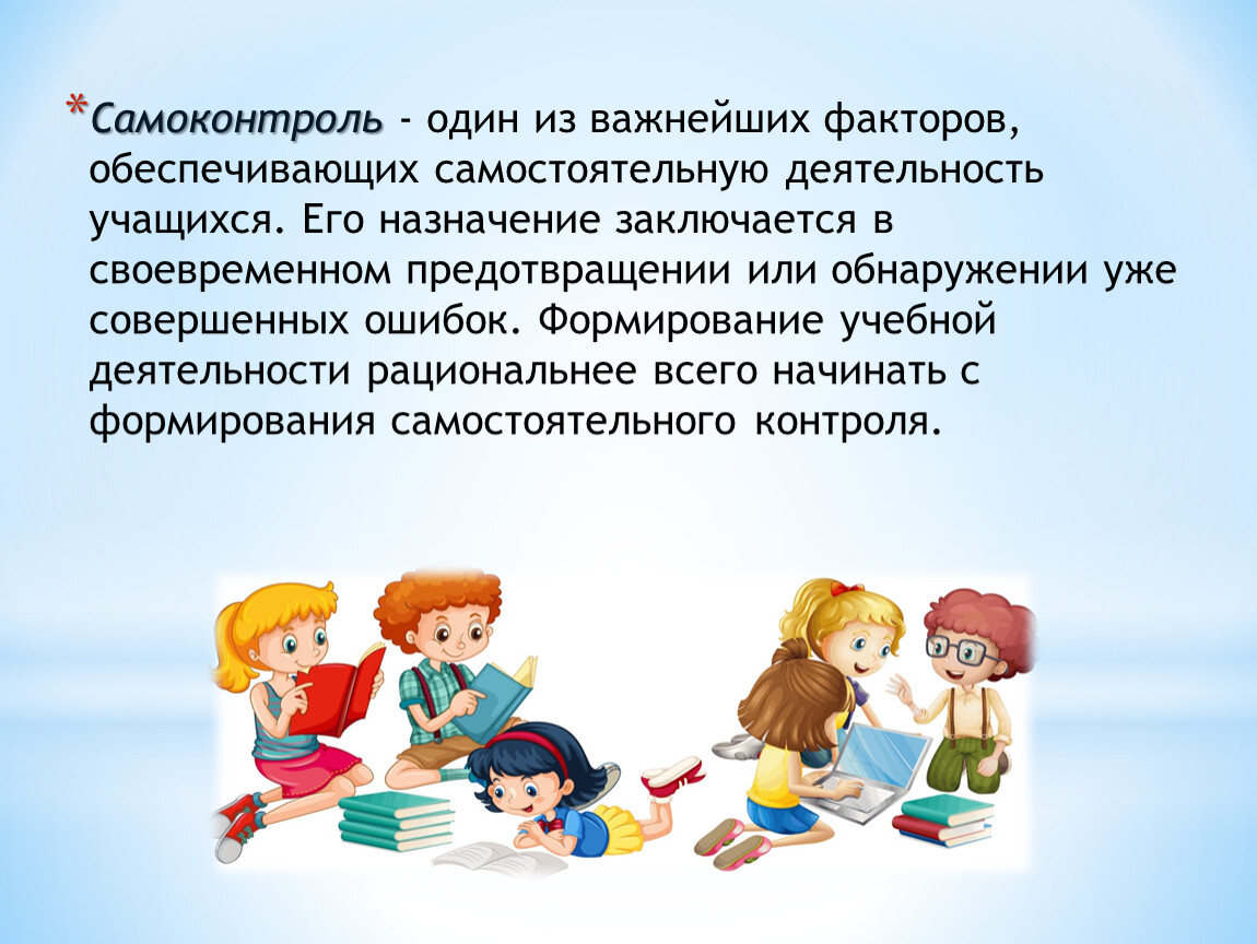 Самоконтроль - один из важнейших факторов, обеспечивающих самостоятельную деятельность учащихся. Его назначение заключается в своевременном предотвращении или обнаружении уже совершенных ошибок. Формирование учебной деятельности рациональнее всего начинать с формирования самостоятельного контроля.