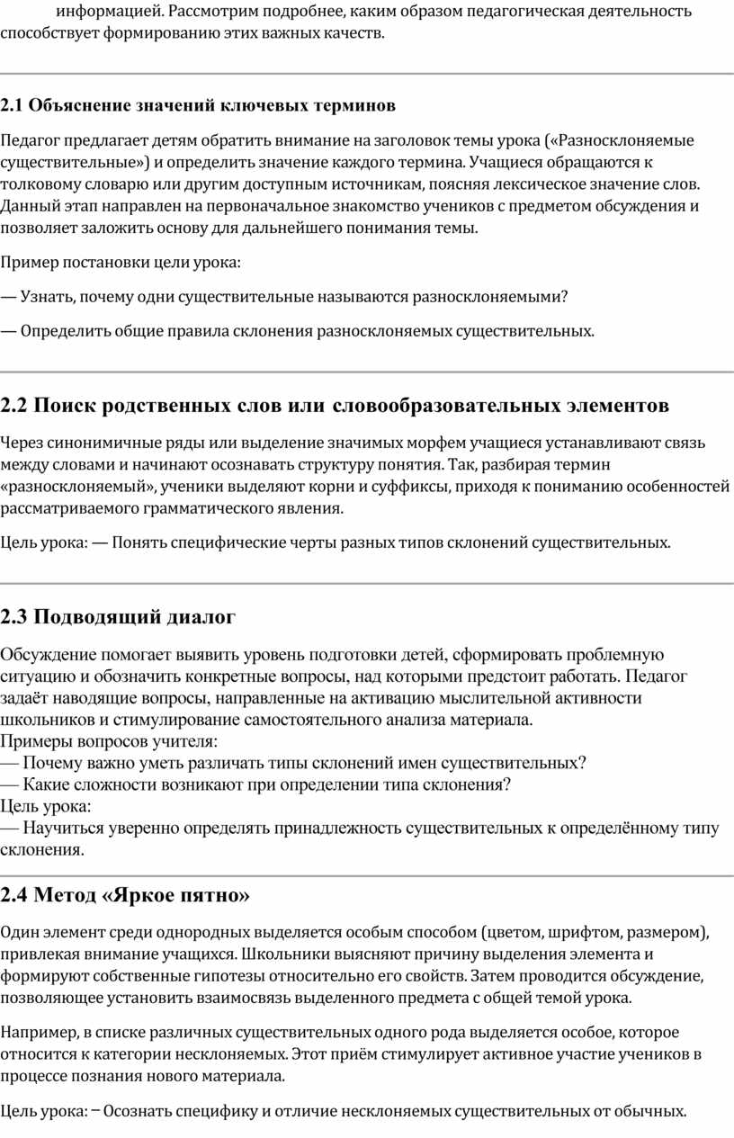 Через синонимичные ряды или выделение значимых морфем учащиеся устанавливают связь между словами и начинают осознавать структуру понятия. Так, разбирая термин «разносклоняемый», ученики выделяют корни и суффиксы, приходя к пониманию особенностей рассматриваемого грамматического явления.