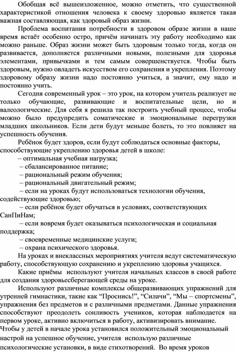 Сегодня современный урок – это урок, на котором учитель реализует не только обучающие, развивающие и воспитательные цели, но и валеологические. Для себя я решила так построить учебный процесс, чтобы можно было предупредить соматические и эмоциональные перегрузки младших школьников. Если дети будут меньше болеть, то это повлияет на успешность обучения.