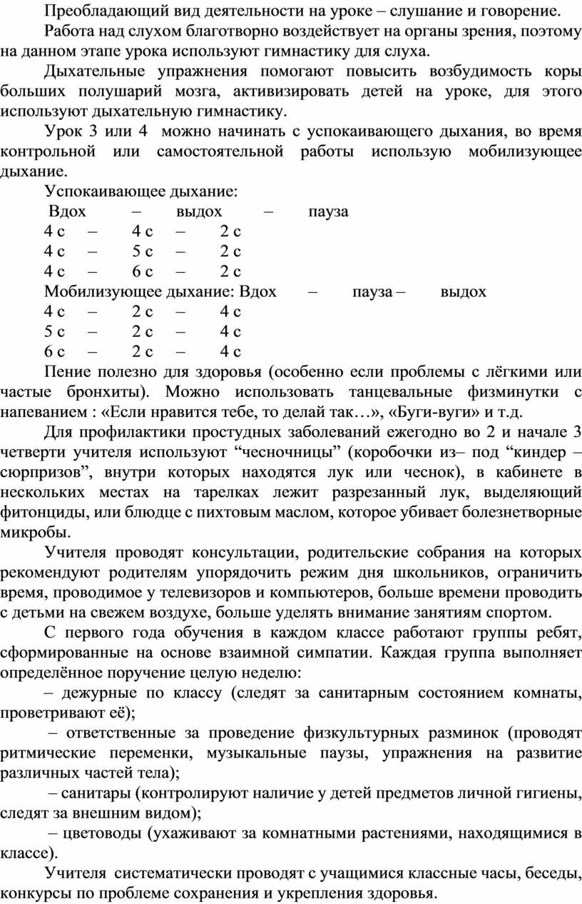 Урок 3 или 4 можно начинать с успокаивающего дыхания, во время контрольной или самостоятельной работы использую мобилизующее дыхание.