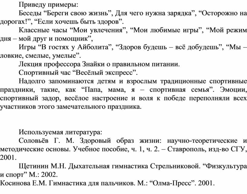 Соловьёв Г. М. Здоровый образ жизни: научно-теоретические и методические основы. Учебное пособие, ч. 1, ч. 2. – Ставрополь, изд-во СГУ, 2001.