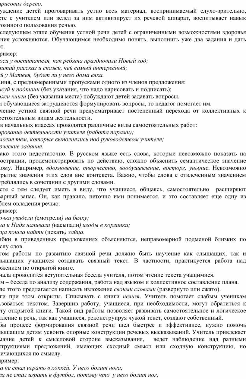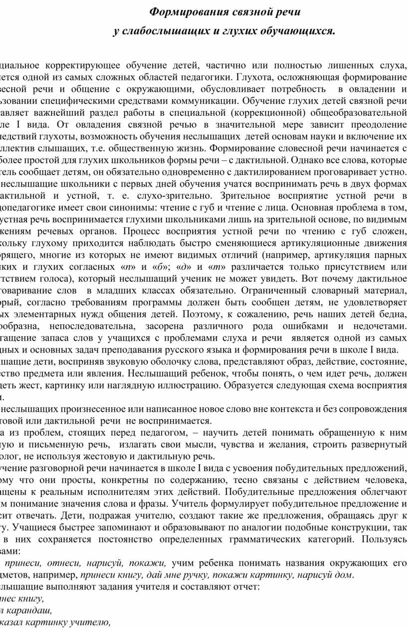 Итогом работы по развитию связной речи должно быть научение как слышащих, так и неслышащих учащихся создавать связный текст. В частности, практикуется работа над изложением по открытой книге.