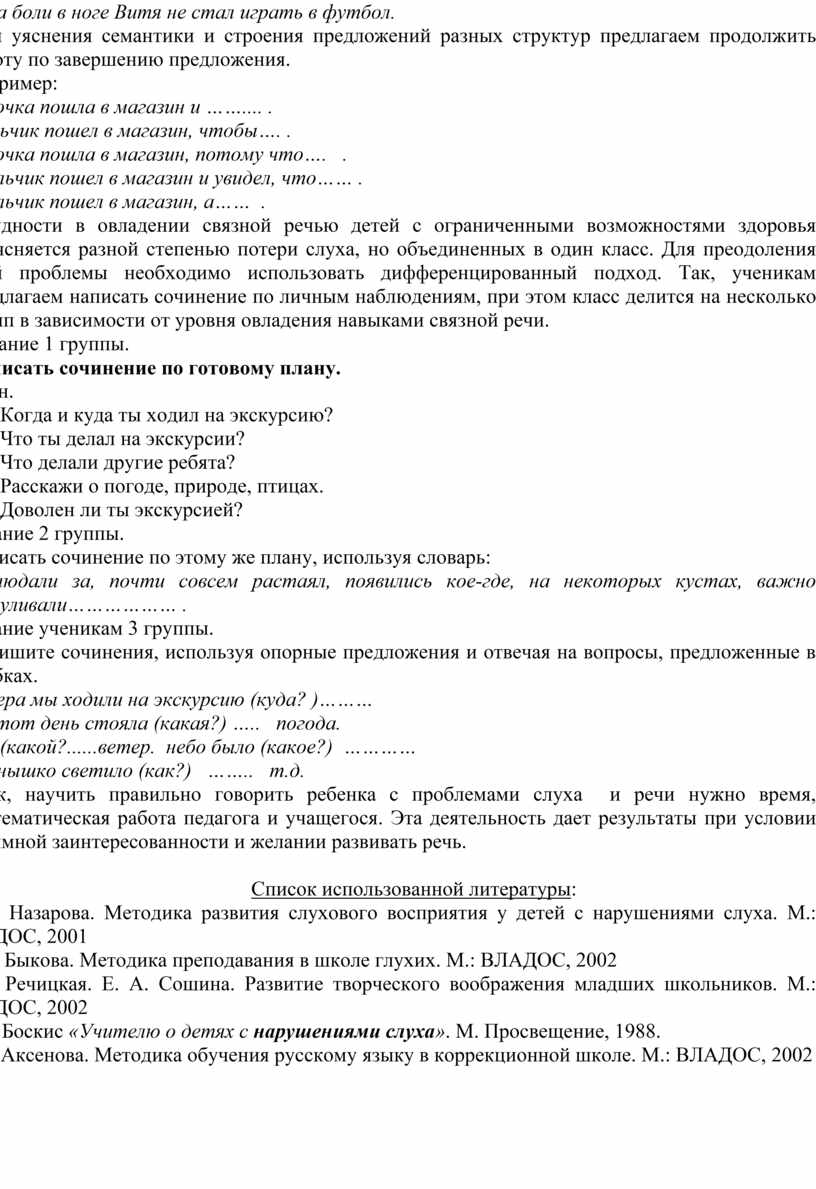Трудности в овладении связной речью детей с ограниченными возможностями здоровья объясняется разной степенью потери слуха, но объединенных в один класс. Для преодоления этой проблемы необходимо использовать дифференцированный подход. Так, ученикам предлагаем написать сочинение по личным наблюдениям, при этом класс делится на несколько групп в зависимости от уровня овладения навыками связной речи.
