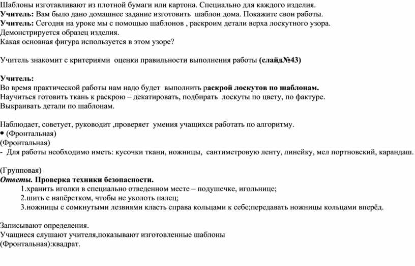 Учитель: Продолжим работу:(Слайд 40-41). Шаблон — это образец, по которому изготавливаются какие-либо одинаковые изделия (слово немецкое). Итак, запишите в тетрадь определения. Шаблоны изготавливают из плотной бумаги или картона. Специально для каждого изделия. Учитель: Вам было дано домашнее задание изготовить шаблон дома. Покажите свои работы. Учитель: Сегодня на уроке мы с помощью шаблонов , раскроим детали верха лоскутного узора. Демонстрируется образец изделия. Какая основная фигура используется в этом узоре?