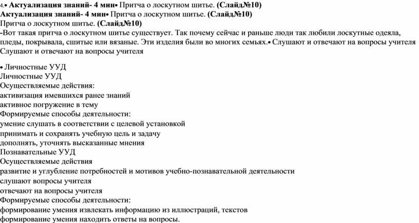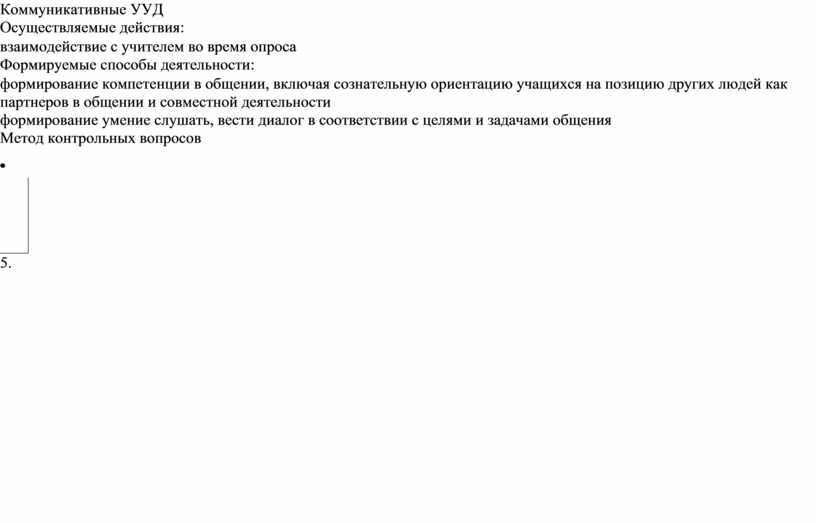 Личностные УУД Осуществляемые действия: · активизация имевшихся ранее знаний активное погружение в тему Формируемые способы деятельности: · умение слушать в соответствии с целевой установкой · принимать и сохранять учебную цель и задачу дополнять, уточнять высказанные мнения Познавательные УУД Осуществляемые действия · развитие и углубление потребностей и мотивов учебно-познавательной деятельности · слушают вопросы учителя · отвечают на вопросы учителя Формируемые способы деятельности: · формирование умения извлекать информацию из иллюстраций, текстов формирование умения находить ответы на вопросы. Коммуникативные УУД Осуществляемые действия: · взаимодействие с учителем во время опроса Формируемые способы деятельности: · формирование компетенции в общении, включая сознательную ориентацию учащихся на позицию других людей как партнеров в общении и совместной деятельности формирование умение слушать, вести диалог в соответствии с целями и задачами общения Метод контрольных вопросов