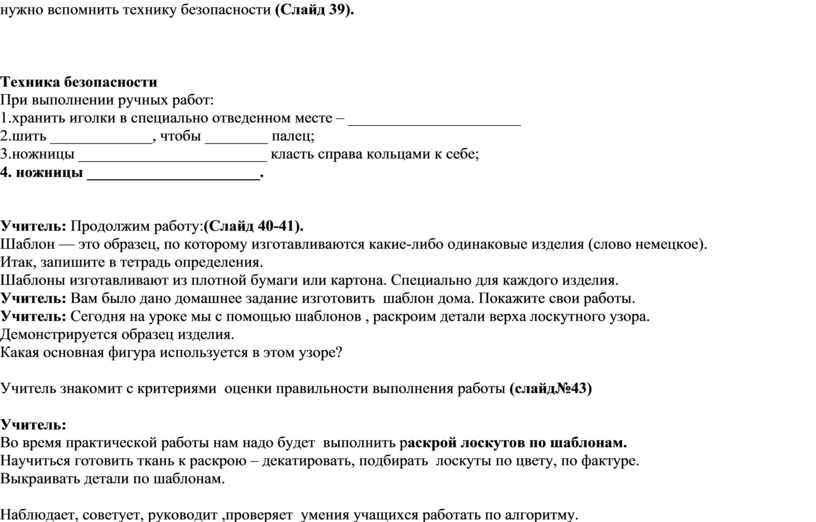 Учитель:В процессе работы вы будете использовать ножницы, иголку, карандаш либо мыло, лекала, а значит нужно вспомнить технику безопасности (Слайд 39).