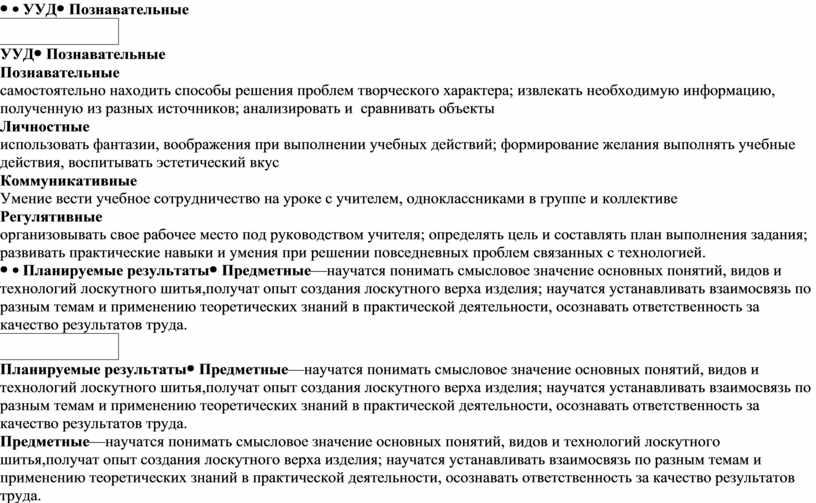 Познавательные самостоятельно находить способы решения проблем творческого характера; извлекать необходимую информацию, полученную из разных источников; анализировать и сравнивать объекты Личностные использовать фантазии, воображения при выполнении учебных действий; формирование желания выполнять учебные действия, воспитывать эстетический вкус Коммуникативные Умение вести учебное сотрудничество на уроке с учителем, одноклассниками в группе и коллективе Регулятивные организовывать свое рабочее место под руководством учителя; определять цель и составлять план выполнения задания; развивать практические навыки и умения при решении повседневных проблем связанных с технологией.