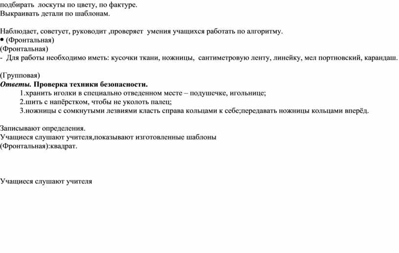 Учитель: Во время практической работы нам надо будет выполнить раскрой лоскутов по шаблонам. Научиться готовить ткань к раскрою – декатировать, подбирать лоскуты по цвету, по фактуре. Выкраивать детали по шаблонам.