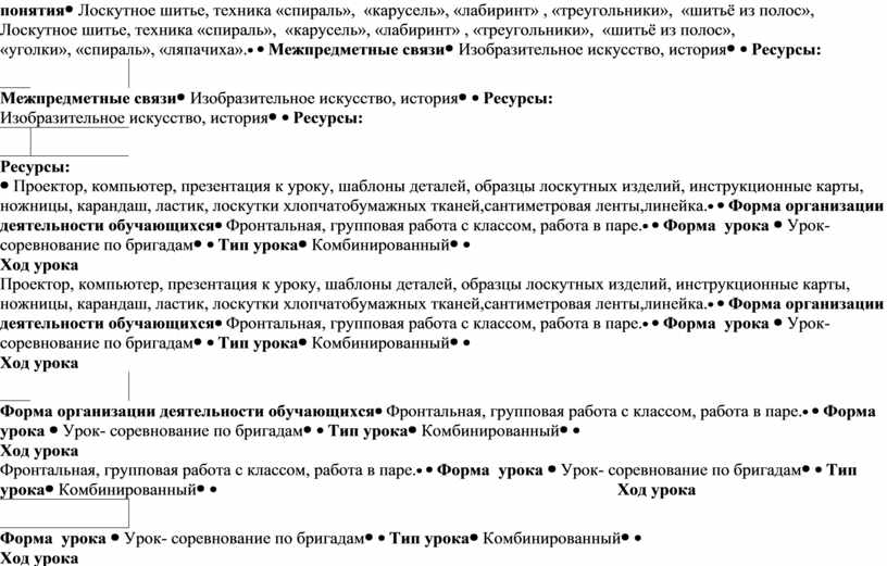 Лоскутное шитье, техника «спираль», «карусель», «лабиринт» , «треугольники», «шитьё из полос», «уголки», «спираль», «ляпачиха». |