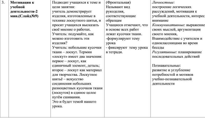 Учитель:В настоящее время к шитью из лоскута относятся как к виду искусства, которое неуклонно растёт. Создавать изделия в лоскутной технике может любой человек, кто этого желает. В работу может пойти не только ткани, но и пряжа, тесьма, ленты, кружева – все, что найдется под рукой и, конечно, ваша фантазия. Учитель организует подводящий или побуждающий диалог по проблемному объяснению нового материала