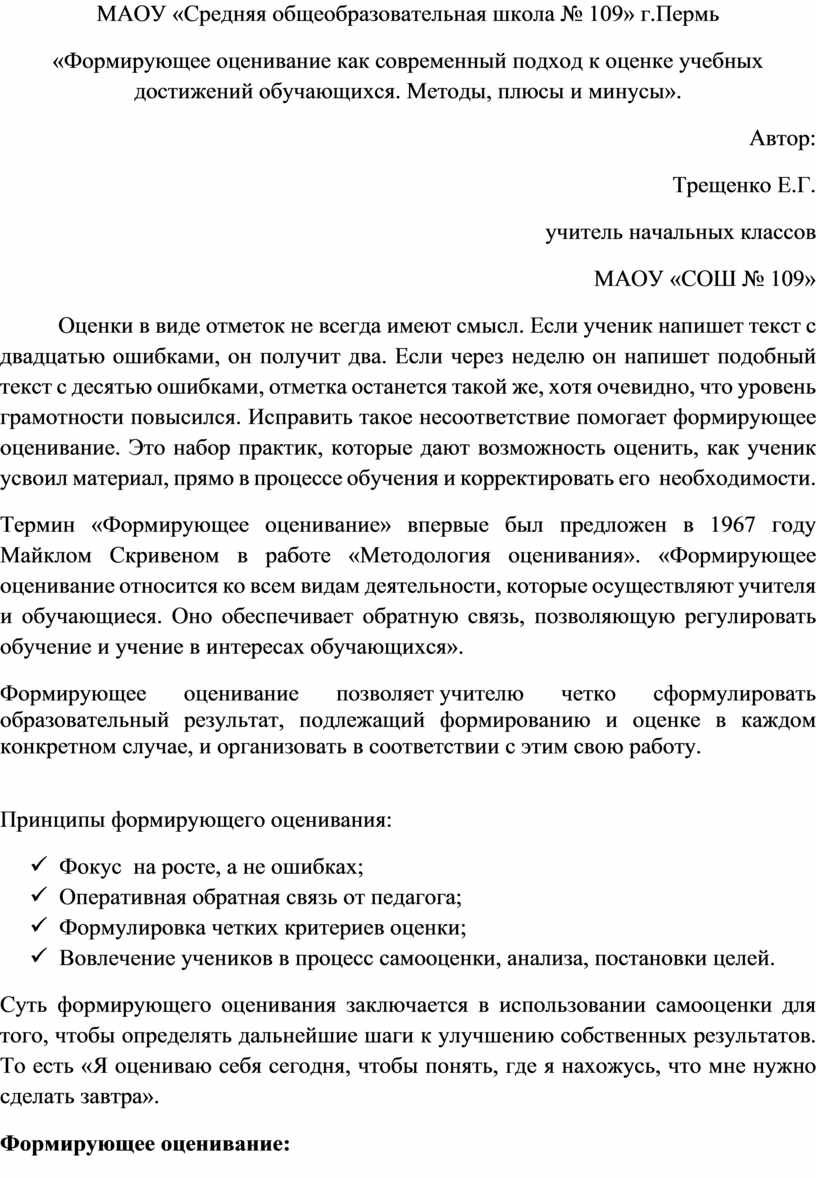 «Формирующее оценивание как современный подход к оценке учебных достижений обучающихся. Методы, плюсы и минусы».