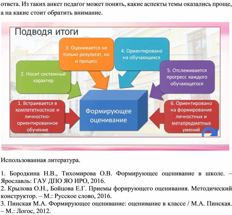 1. Бородкина Н.В., Тихомирова О.В. Формирующее оценивание в школе. – Ярославль: ГАУ ДПО ЯО ИРО, 2016.