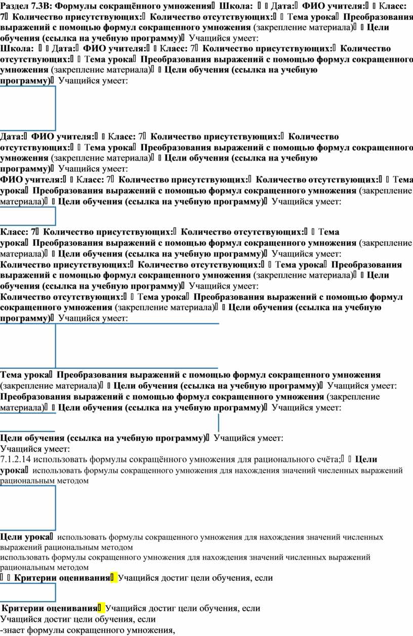 Учащийся умеет: 7.1.2.14 использовать формулы сокращённого умножения для рационального счёта; |