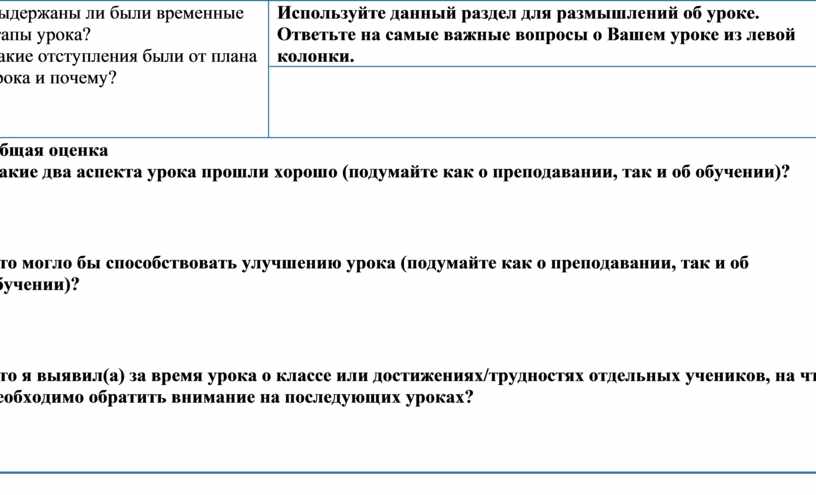 Используйте данный раздел для размышлений об уроке. Ответьте на самые важные вопросы о Вашем уроке из левой колонки. |