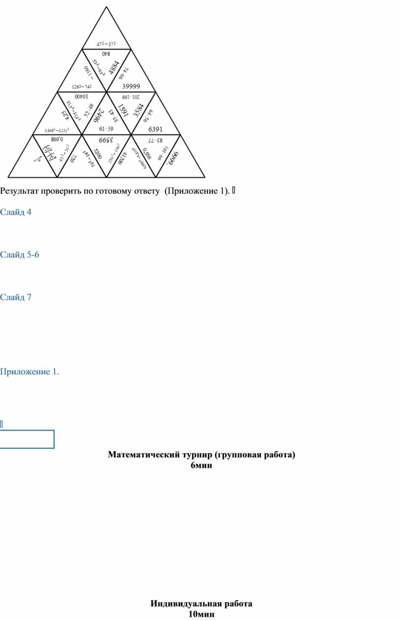 Групповая работа (3-4 ученика) Тарсия. Из предложенных карточек необходимо соотнести пример с его решением, подобрать соответствие по сторонам треугольников и в результате должны получить равносторонний треугольник.