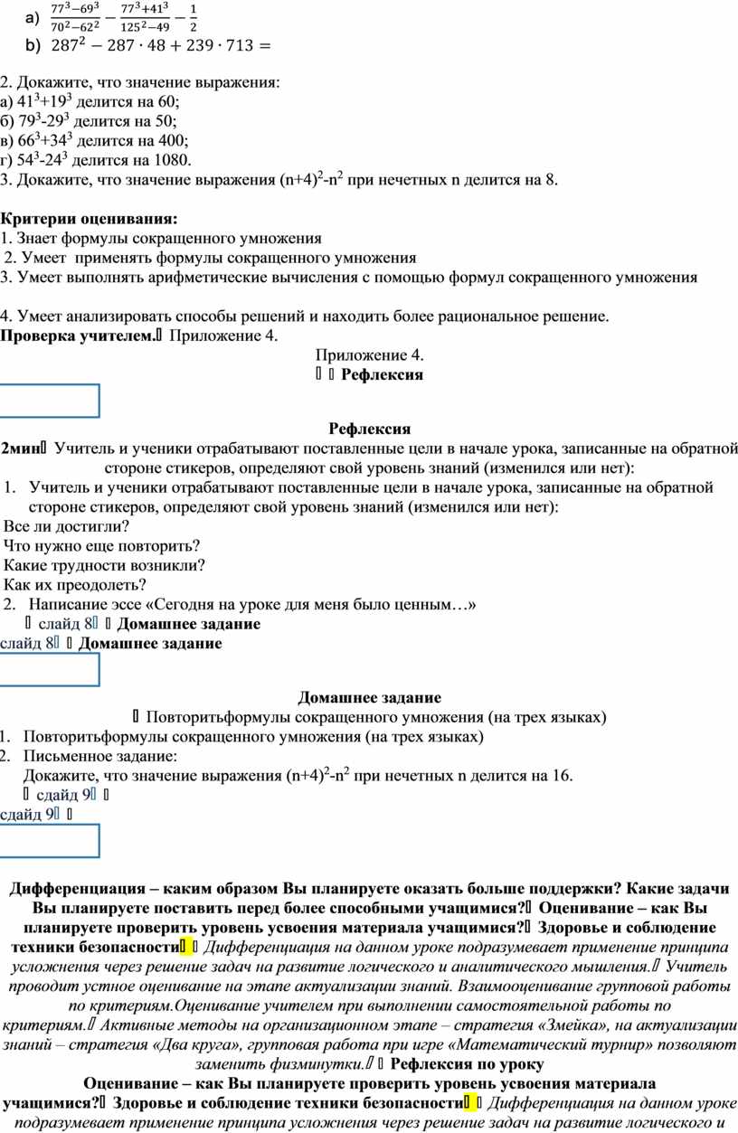 Критерии оценивания: 1. Знает формулы сокращенного умножения 2. Умеет применять формулы сокращенного умножения 3. Умеет выполнять арифметические вычисления с помощью формул сокращенного умножения