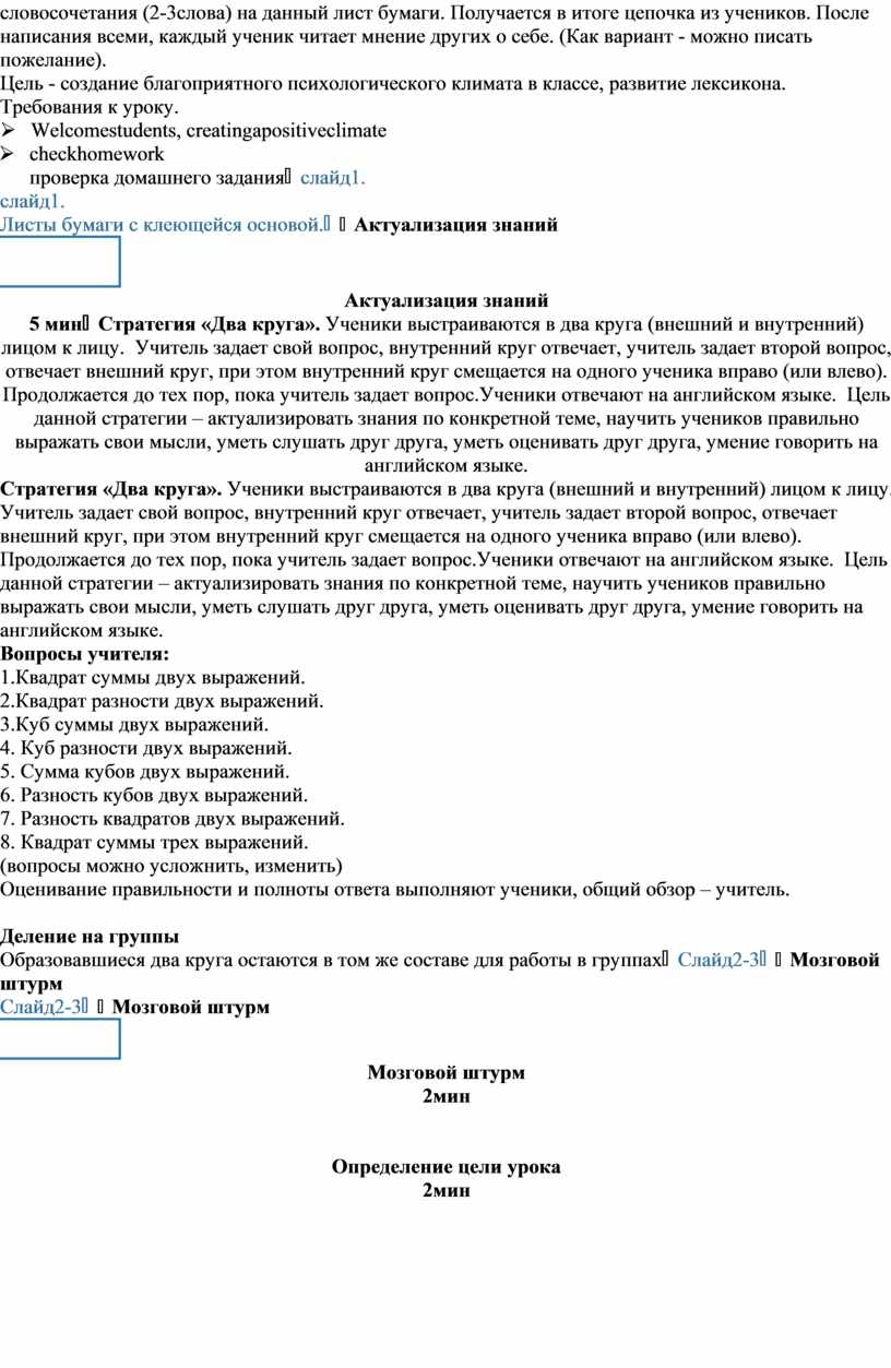 Стратегия «Два круга». Ученики выстраиваются в два круга (внешний и внутренний) лицом к лицу. Учитель задает свой вопрос, внутренний круг отвечает, учитель задает второй вопрос, отвечает внешний круг, при этом внутренний круг смещается на одного ученика вправо (или влево). Продолжается до тех пор, пока учитель задает вопрос.Ученики отвечают на английском языке. Цель данной стратегии – актуализировать знания по конкретной теме, научить учеников правильно выражать свои мысли, уметь слушать друг друга, уметь оценивать друг друга, умение говорить на английском языке. Вопросы учителя: 1.Квадрат суммы двух выражений. 2.Квадрат разности двух выражений. 3.Куб суммы двух выражений. 4. Куб разности двух выражений. 5. Сумма кубов двух выражений. 6. Разность кубов двух выражений. 7. Разность квадратов двух выражений. 8. Квадрат суммы трех выражений. (вопросы можно усложнить, изменить) Оценивание правильности и полноты ответа выполняют ученики, общий обзор – учитель.