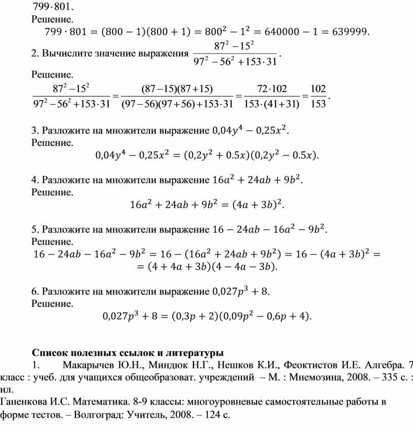 1. Макарычев Ю.Н., Миндюк Н.Г., Нешков К.И., Феоктистов И.Е. Алгебра. 7 класс : учеб. для учащихся общеобразоват. учреждений – М. : Мнемозина, 2008. – 335 с. : ил.