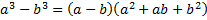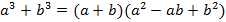 называется соответственно неполным квадратом разности и суммы. Данное выражение отличается от полного квадрата лишь коэффициентом перед ab. Учащийся должны устно сформулировать формулы сокращенного умножения: - Сумма кубов двух выражений равна произведению суммы первого и второго выражения на неполный квадрат разности этих выражений. - Разность кубов двух выражений равна произведению разности первого и второго выражения на неполный квадрат разности этих выражений. |