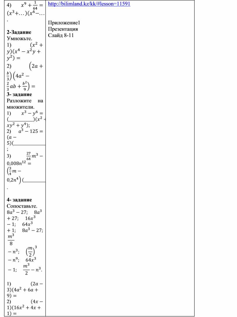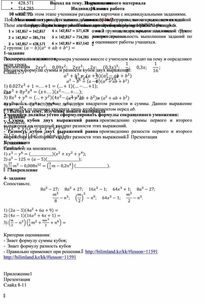 Критерии оценивания: - Знает формулу суммы кубов; - Знает формулу разность кубов - Правильно применяет при решении. |