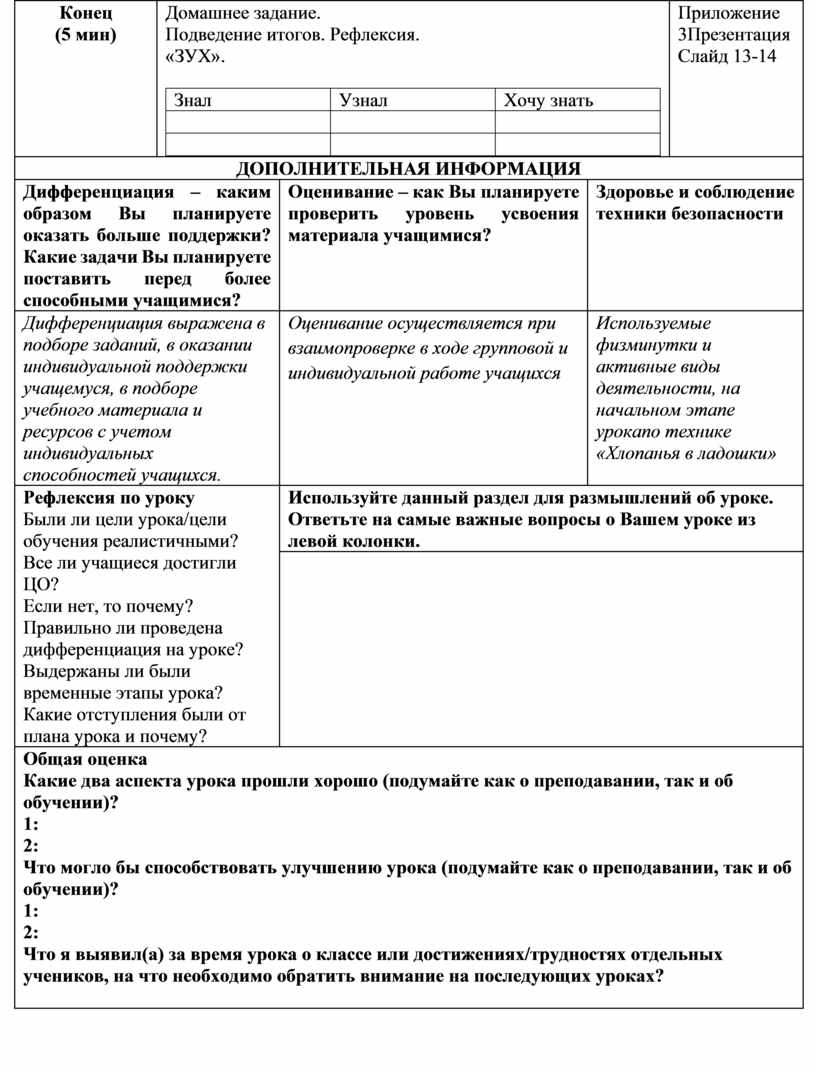 Домашнее задание. Подведение итогов. Рефлексия. «ЗУХ».