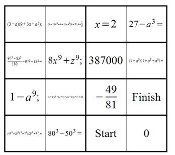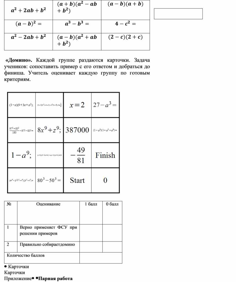 «Домино». Каждой группе раздаются карточки. Задача учеников: сопоставить пример с его ответом и добраться до финиша. Учитель оценивает каждую группу по готовым критериям.
