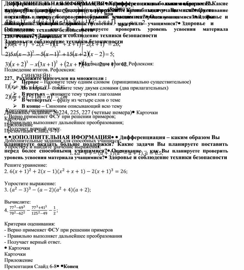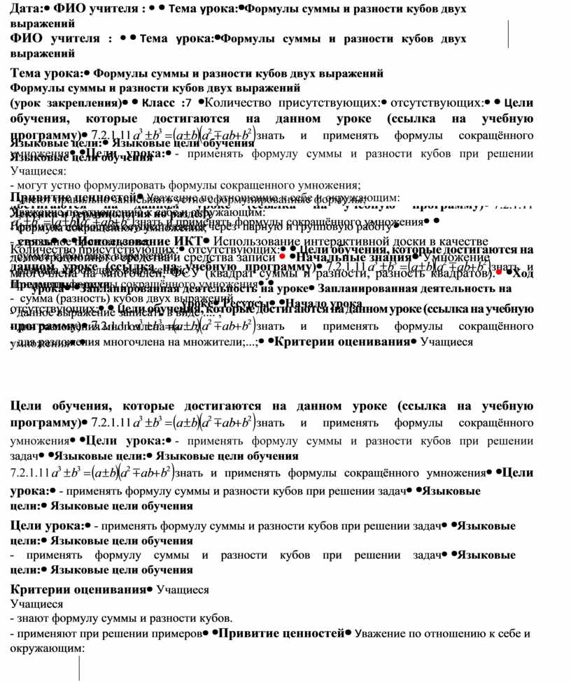 Языковые цели обучения Учащиеся: - могут устно формулировать формулы сокращенного умножения; - умеют правильно записывать устно сформулированные формулы; Лексика и терминология по разделу - формула сокращенного умножения; - утроенное произведение; - сумма кубов двух выражений; - разница кубов двух выражений; Предметные цели - сумма (разность) кубов двух выражений ...... ; - данное выражение записать в виде .... ; - для разложения многочлена на ... ; - для разложения многочлена на множители;...; |