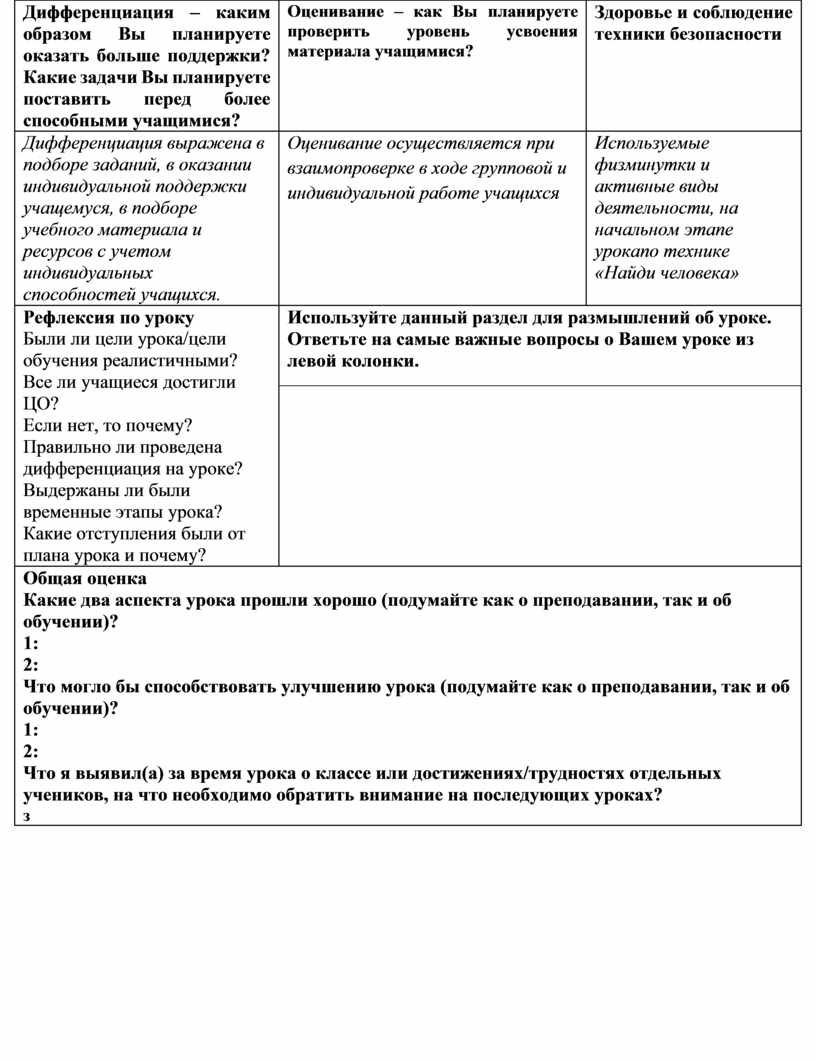 Рефлексия по уроку Были ли цели урока/цели обучения реалистичными? Все ли учащиеся достигли ЦО? Если нет, то почему? Правильно ли проведена дифференциация на уроке? Выдержаны ли были временные этапы урока? Какие отступления были от плана урока и почему? |