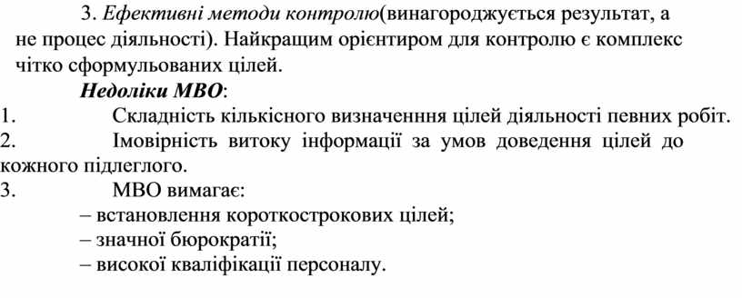 3. Ефективні методи контролю(винагороджується результат, а не процес діяльності). Найкращим орієнтиром для контролю є комплекс чітко сформульованих цілей.