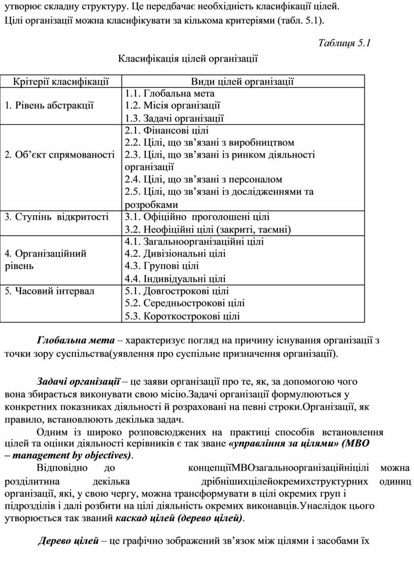утворює складну структуру. Це передбачає необхідність класифікації цілей. Цілі організації можна класифікувати за кількома критеріями (табл. 5.1).