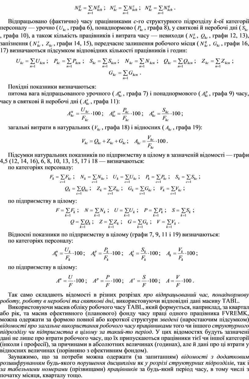 Використовуючи масив обліку робочого часу TABL, який формується, наприклад, за квартал або рік, та масив ефективного (планового) фонду часу праці одного працівника FVREMK, можна одержати за формою повної або короткої структури зведені (наростаючим підсумком) відомості про загальне використання робочого часу працівниками того чи іншого структурного підрозділу чи підприємства в цілому за такий-то період. У цих відомостях будуть зазначені дані не лише про втрати робочого часу, що їх припускаються працівники тієї чи іншої категорії (інколи і професії), за причинами в абсолютних величинах (годинах), але й дані про ці втрати у відносних величинах (порівняно з ефективним фондом).