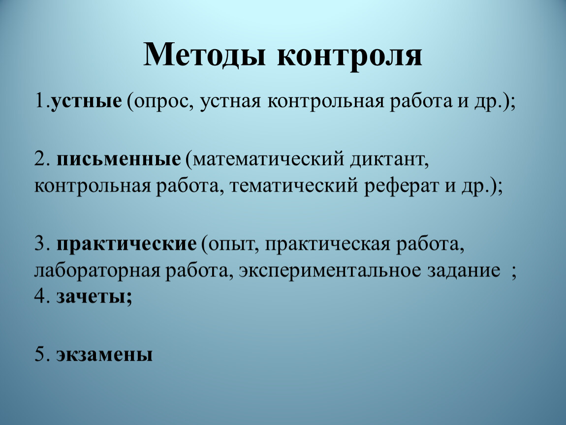 Виды проверки знаний. Текущая проверка: выполняет несколько важных функций. Для учителя это средство самопроверки. Результаты проверки успеваемости позволяют корректировать методику обучения, изо дня в день добиваться поставленной цели обучения. Для школьников и их родителей отметки за успеваемость являются сигналами, стимулирующими учебную работу. Для текущей проверки могут быть использованы все методы, но чаще всего она проводится с помощью индивидуального или фронтального устного опроса. Итоговая проверка: основной целью ставит объективное выявление результатов обучения, которые позволяют определить соответствие или несоответствие действительных результатов обучения запланированным в программе.