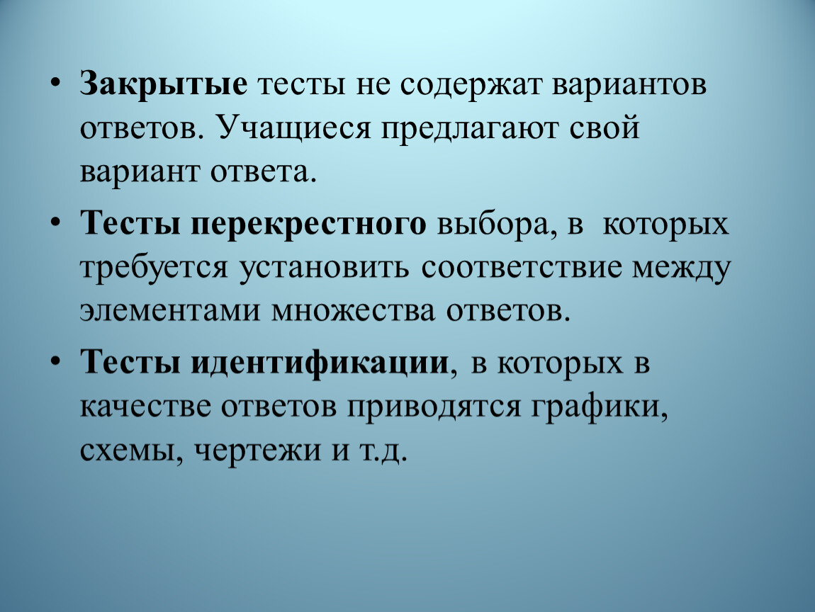 Закрытые тесты не содержат вариантов ответов. Учащиеся предлагают свой вариант ответа.