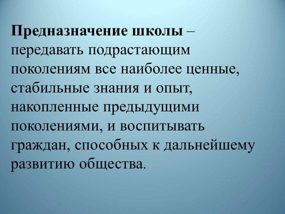Предназначение школы – передавать подрастающим поколениям все наиболее ценные, стабильные знания и опыт, накопленные предыдущими поколениями, и воспитывать граждан, способных к дальнейшему развитию общества.
