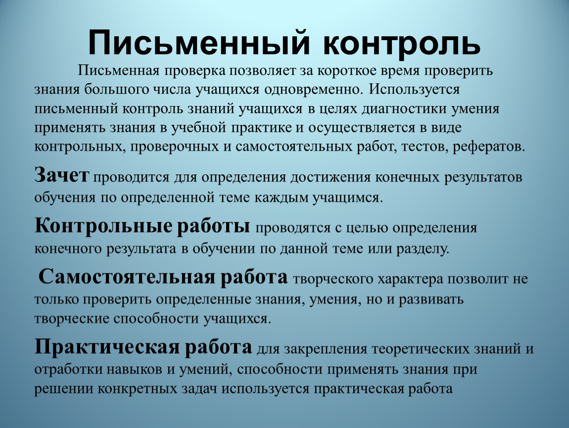 Письменная проверка позволяет за короткое время проверить знания большого числа учащихся одновременно. Используется письменный контроль знаний учащихся в целях диагностики умения применять знания в учебной практике и осуществляется в виде контрольных, проверочных и самостоятельных работ, тестов, рефератов.