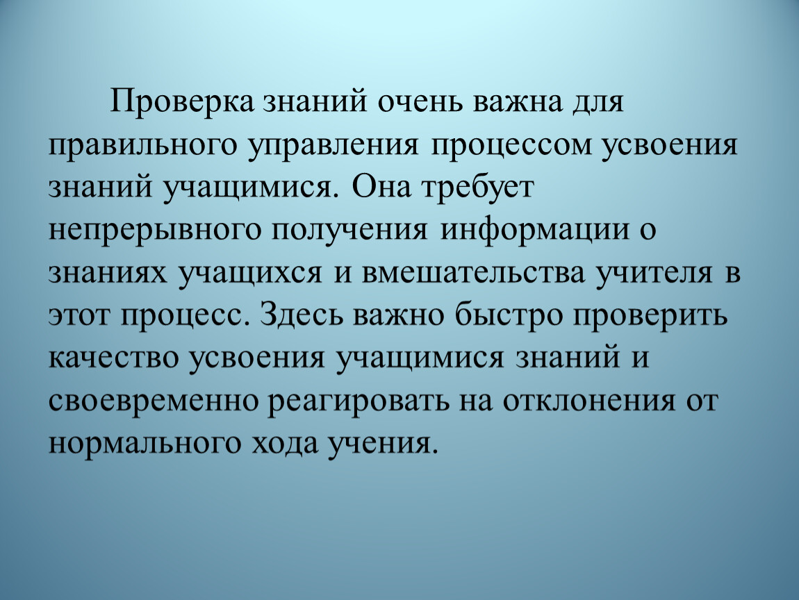Проверка знаний очень важна для правильного управления процессом усвоения знаний учащимися. Она требует непрерывного получения информации о знаниях учащихся и вмешательства учителя в этот процесс. Здесь важно быстро проверить качество усвоения учащимися знаний и своевременно реагировать на отклонения от нормального хода учения.