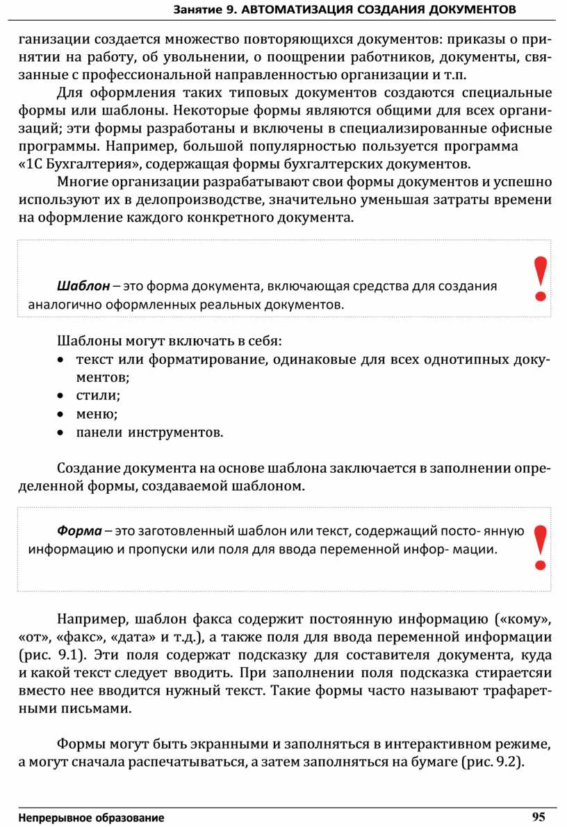 ганизации создается множество повторяющихся документов: приказы о при- нятии на работу, об увольнении, о поощрении работников, документы, свя- занные с профессиональной направленностью организации и т.п.