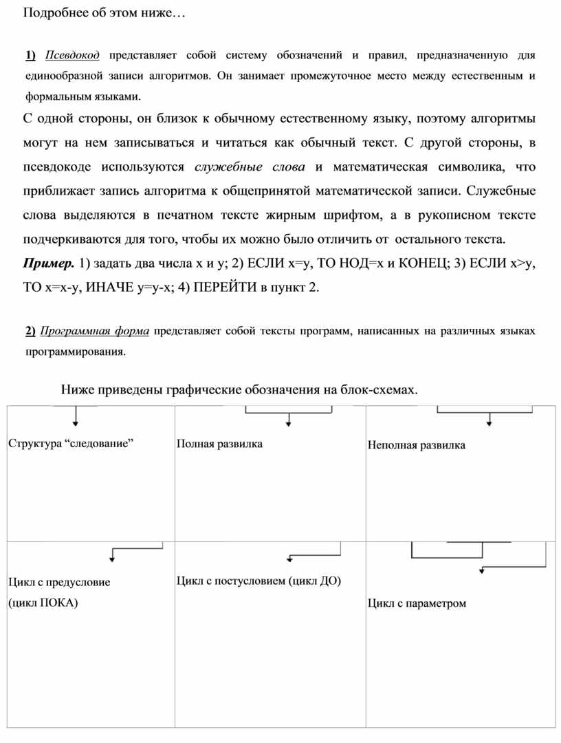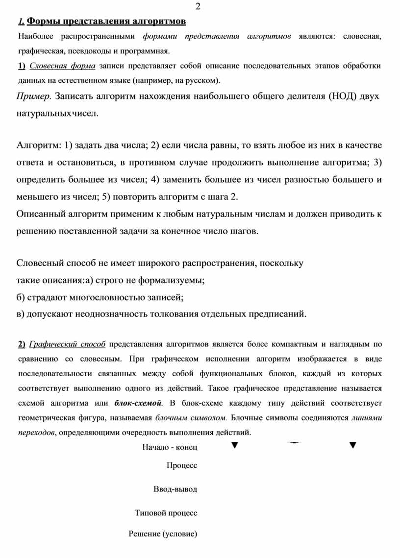 1) Словесная форма записи представляет собой описание последовательных этапов обработки данных на естественном языке (например, на русском).